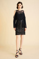 The sheer neckline offers a glimpse of subtle sensuality, elegantly framing the face and collarbone. Long sleeves, adorned with playful fringe, cascade gracefully, enhancing your movements with every step. Fringed sides at the waist create a flattering silhouette, emphasizing your figure while adding a touch of vintage glamour. Intricate beadwork adds a layer of luxury and craftsmanship, creating a mesmerizing effect that captures the light and draws admiration.