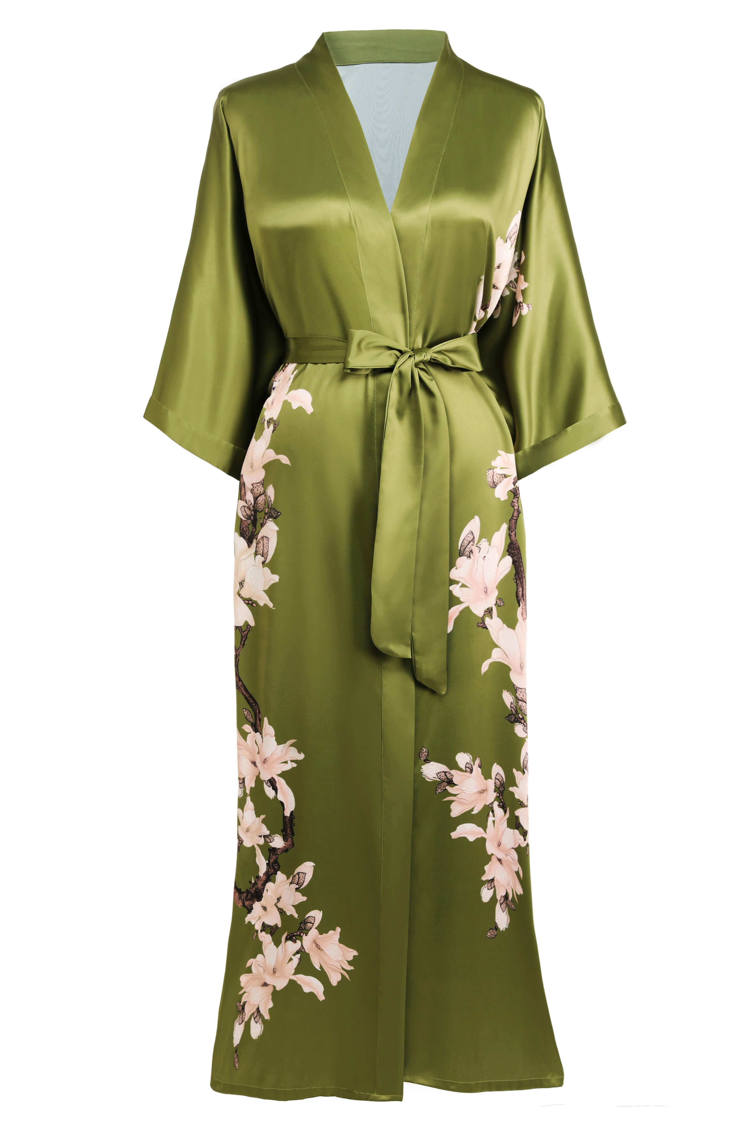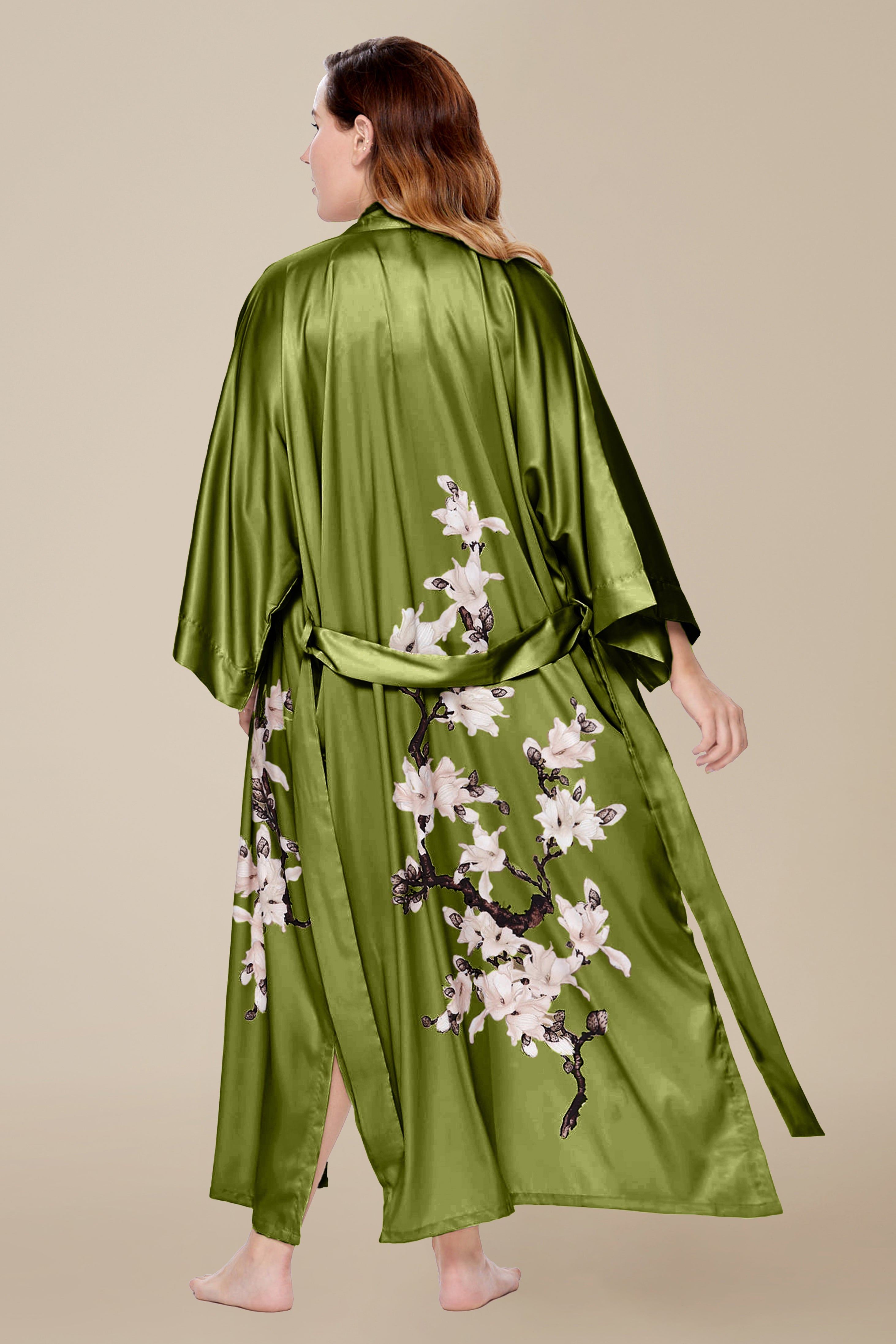 Slip into serene sophistication with this breezy floral kimono—V-neck allure, a cascading sash, and airy satin drape effortlessly elevate lounging or celebrations.