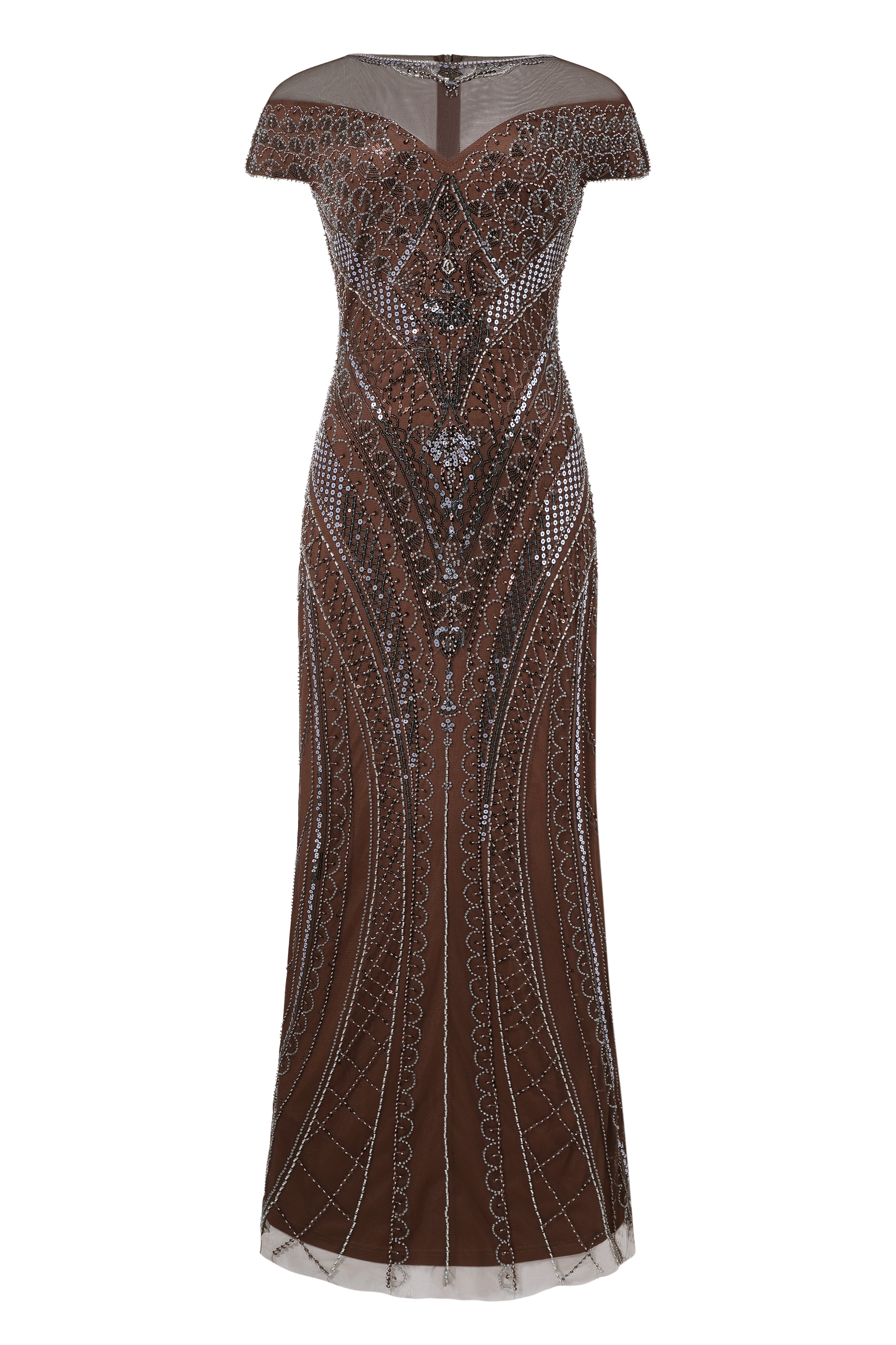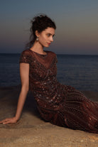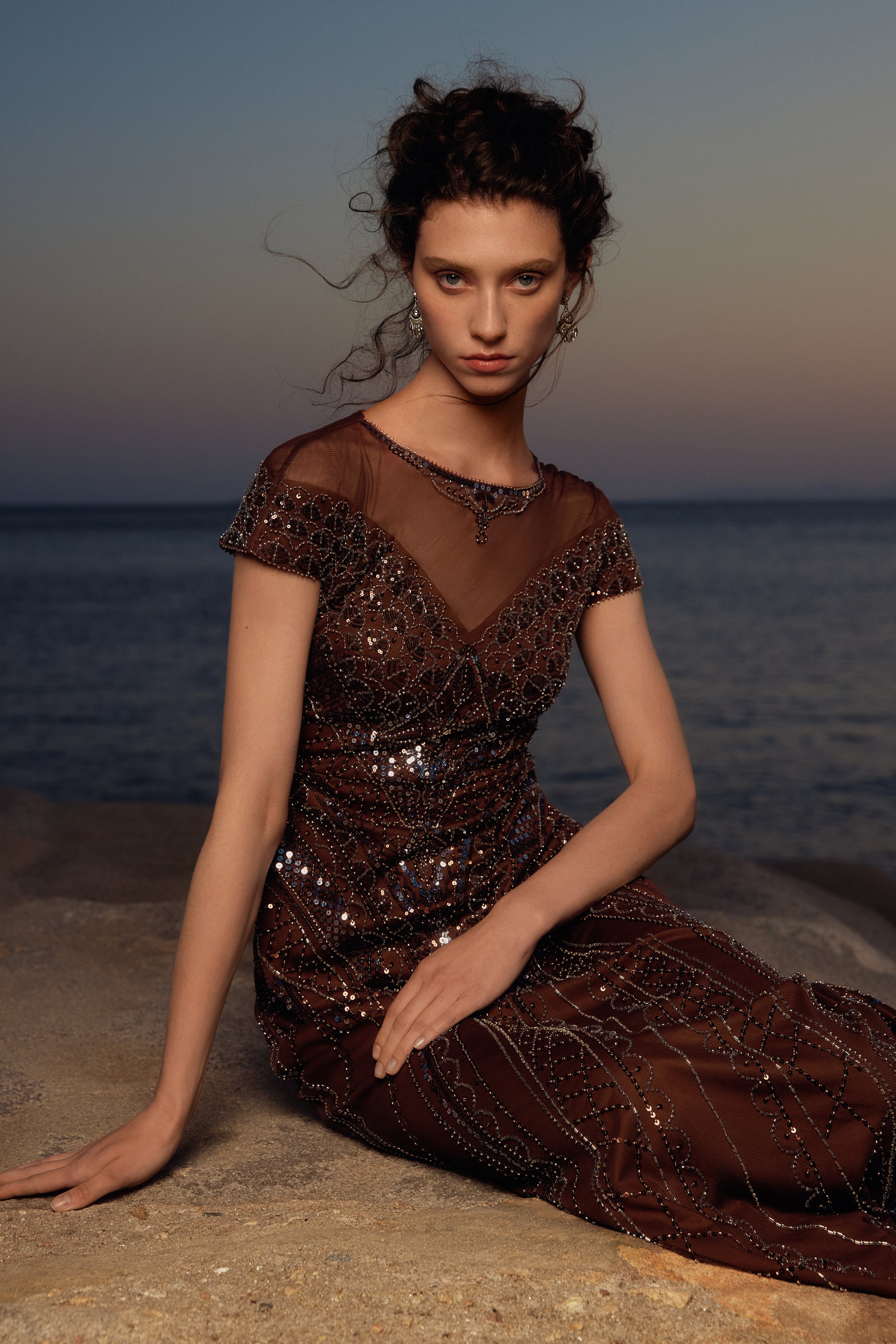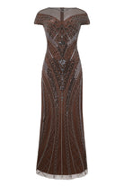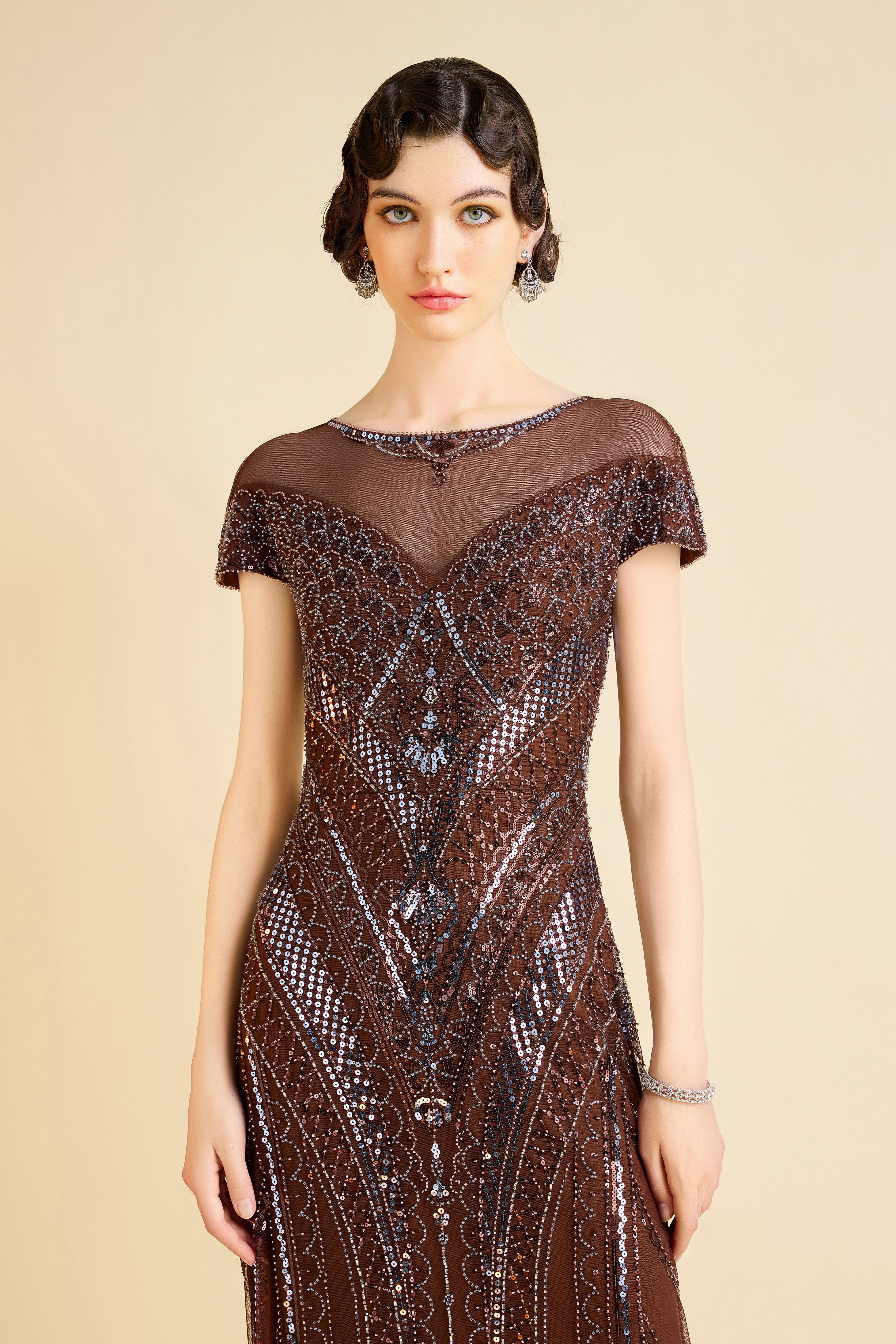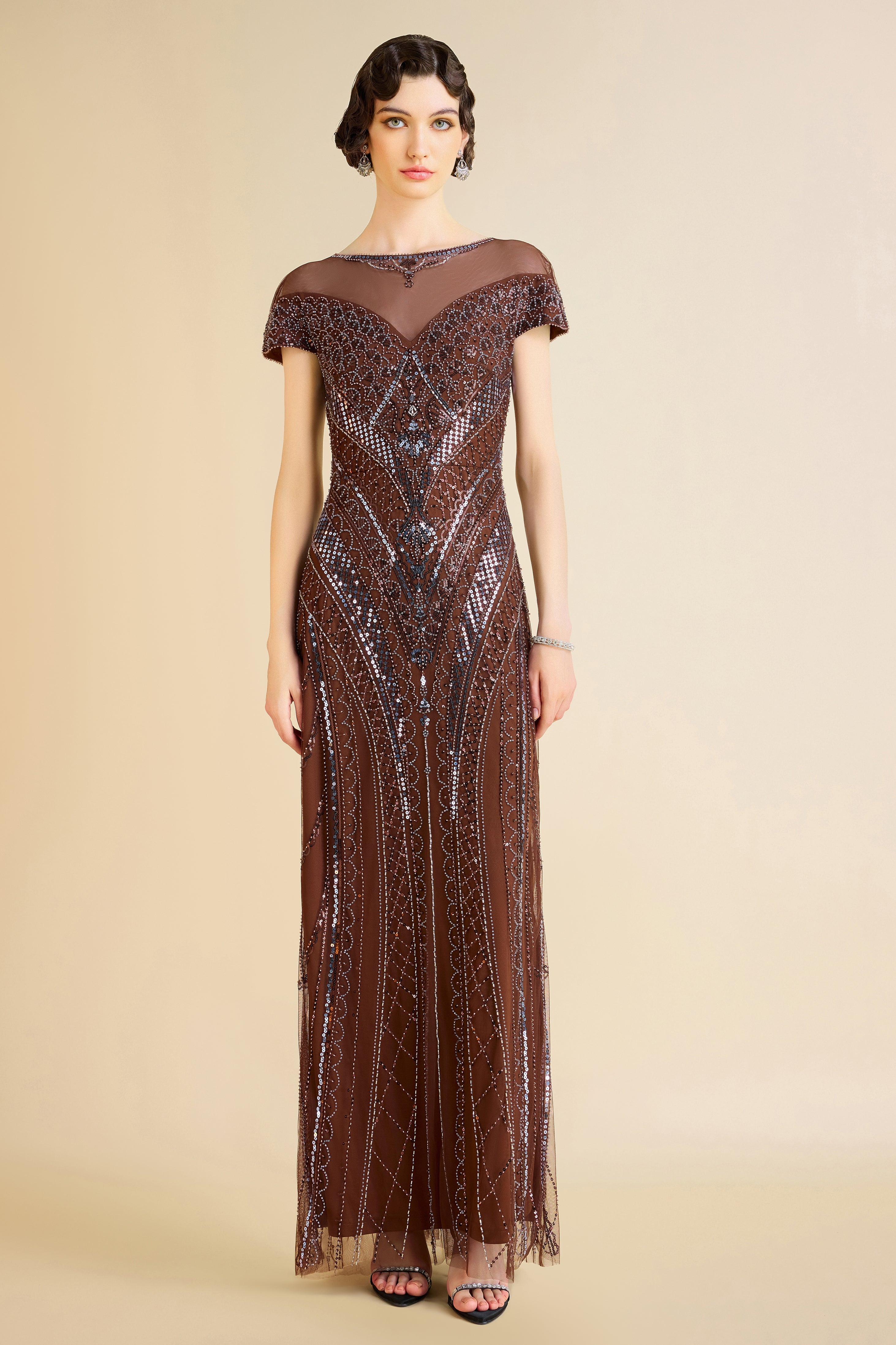 The see-through neckline exudes allure, perfectly complemented by the geometric pattern embroidery that sparkles with captivating radiance, like stars in a midnight sky. The dress's delicate cap sleeves add a touch of elegance, framing your shoulders with grace. Whether you're sipping champagne at a rooftop soirée or twirling on the dance floor at a gala, this dress is a true showstopper.