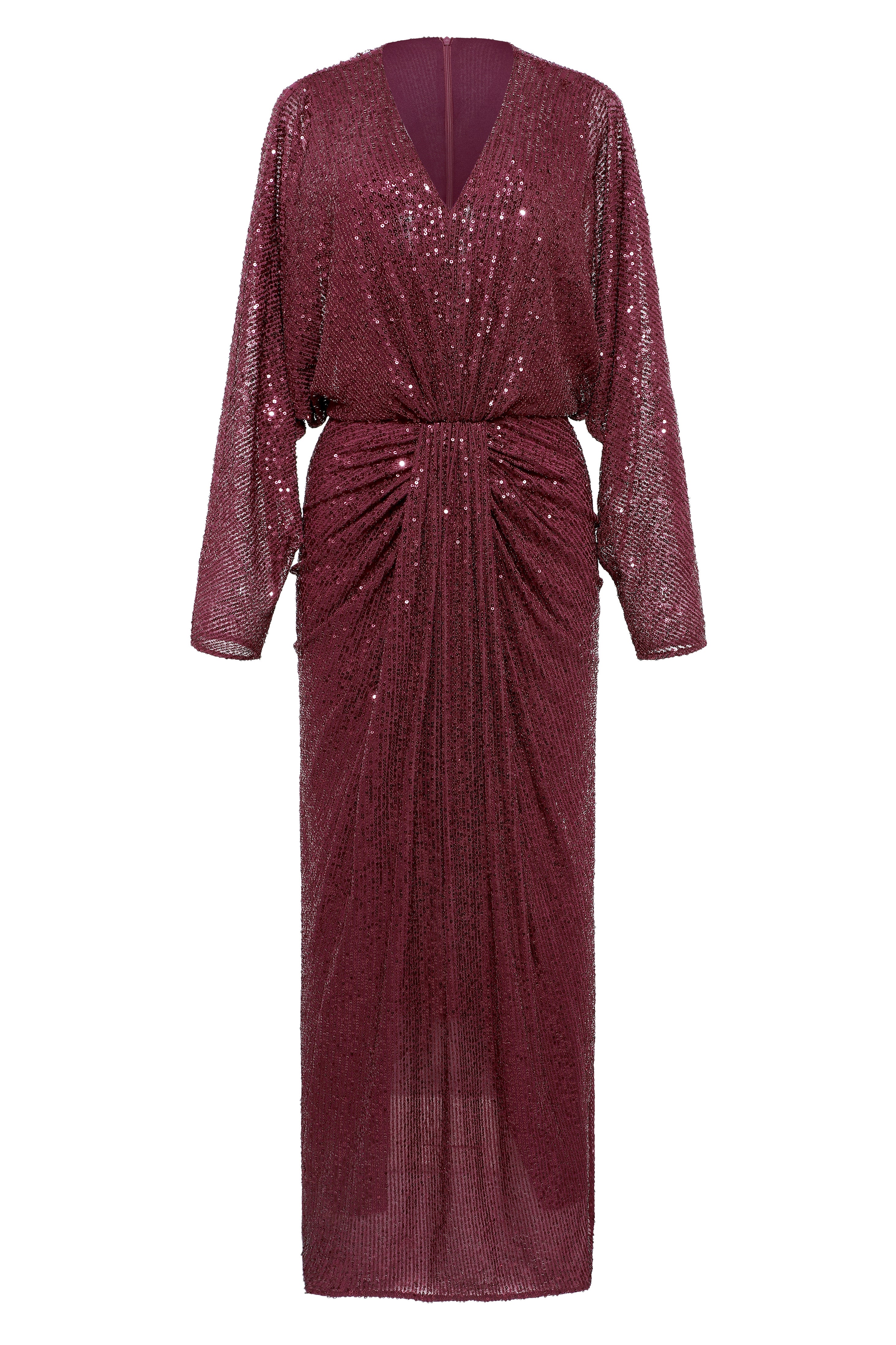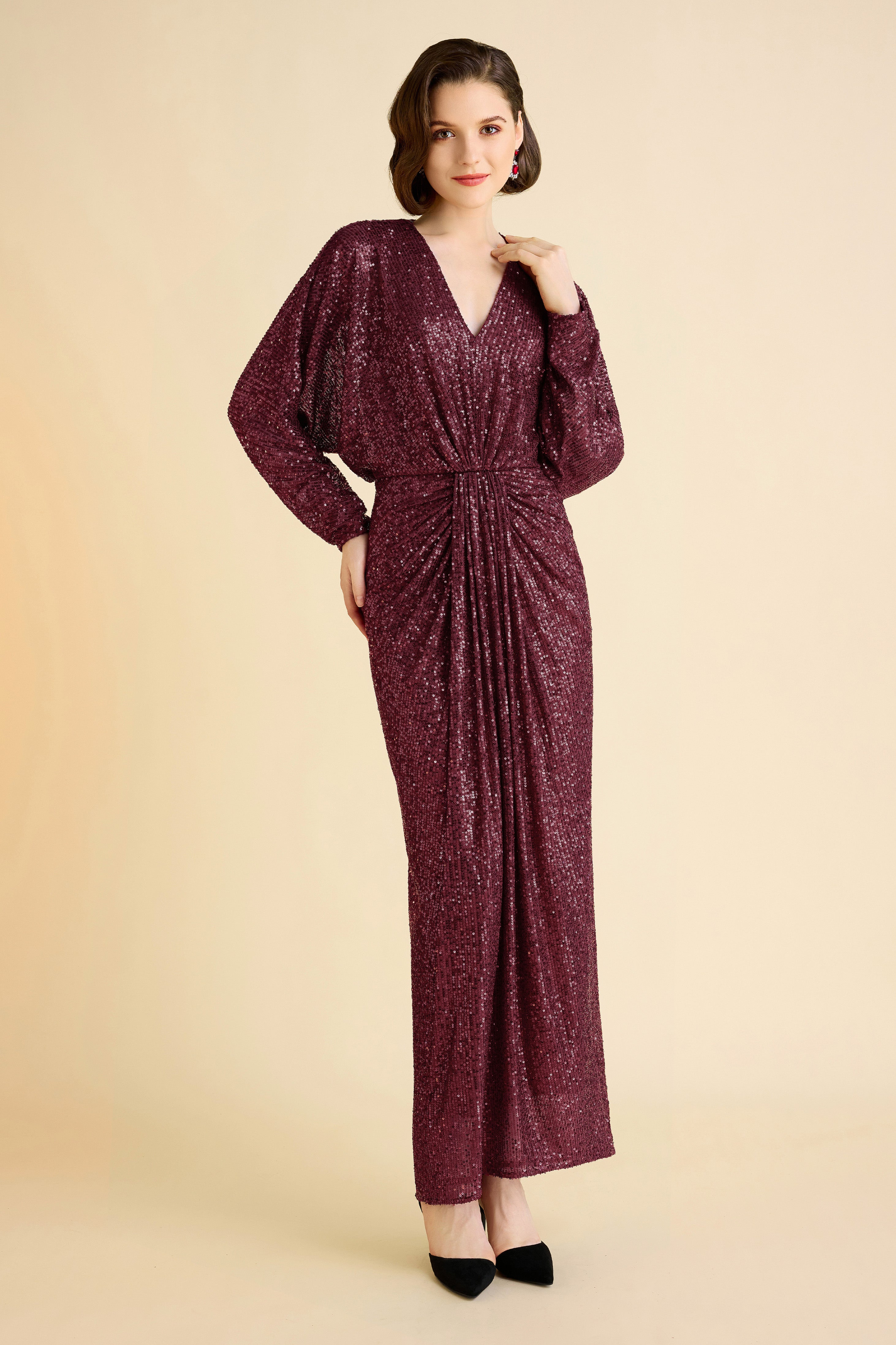 Envision a night where you are the center of attention, draped in this exquisite dress that effortlessly combines sophistication with allure. The deep V-neckline draws the eye upward, creating an elegant frame that elongates your shoulders and neckline. As you move, the luxurious batwing sleeves billow gently, adding a dramatic flair that captures the essence of modern glamour. The gathered waist detail works its magic, subtly smoothing and concealing the midsection, ensuring you look flawless from every angle.