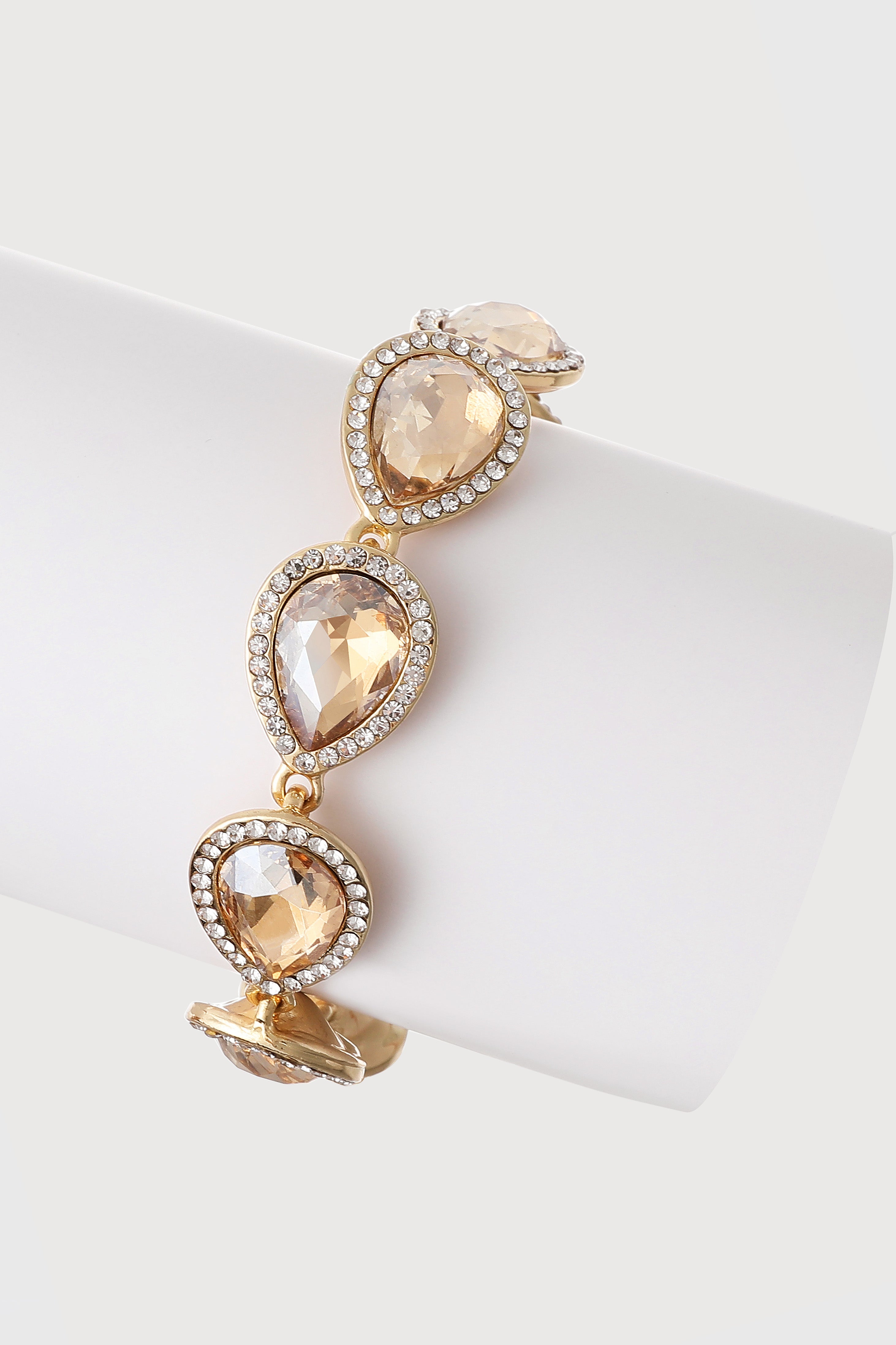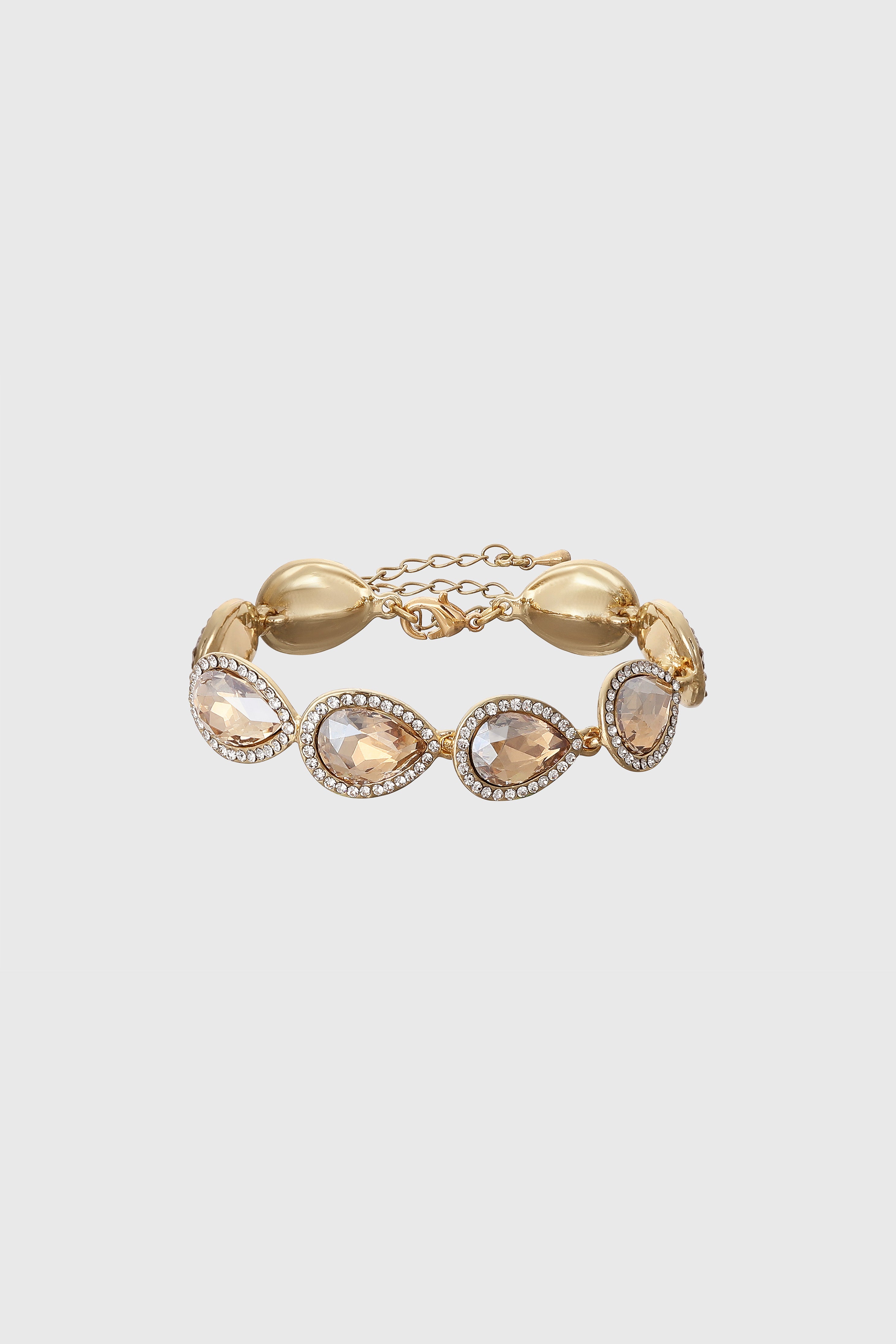 This stunning gold-tone bracelet features elegant teardrop-shaped crystals, each framed by shimmering rhinestones. With its adjustable chain closure and lightweight design, it offers both comfort and sophistication.