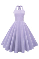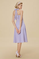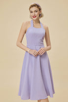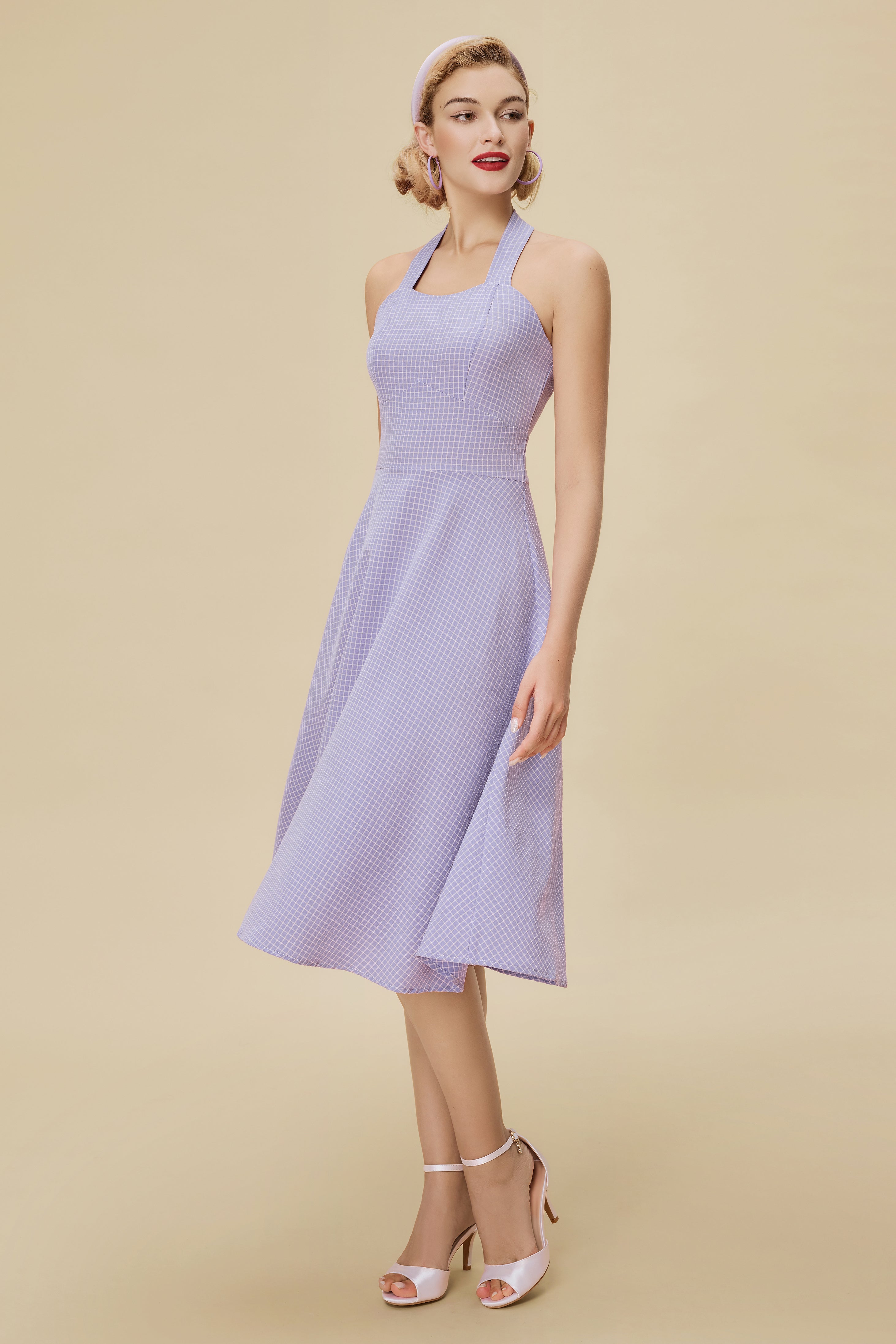 Capture the spirit of mid-century elegance with this purple and white gingham halter swing dress. The crisp check pattern evokes sunny afternoons and carefree charm, while the halter neckline frames the shoulders with vintage allure. Whether paired with pearls and kitten heels or sandals and a sun hat, this dress turns every outing into a timeless moment.